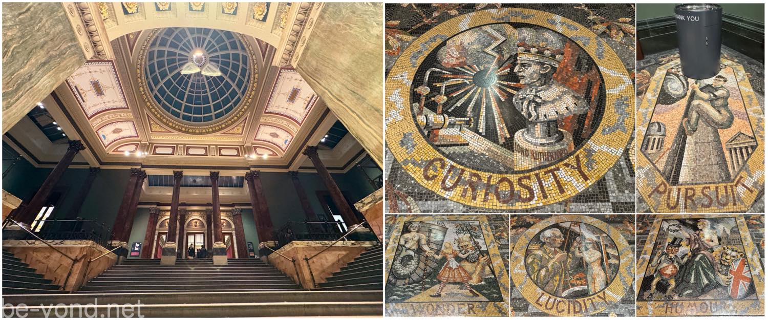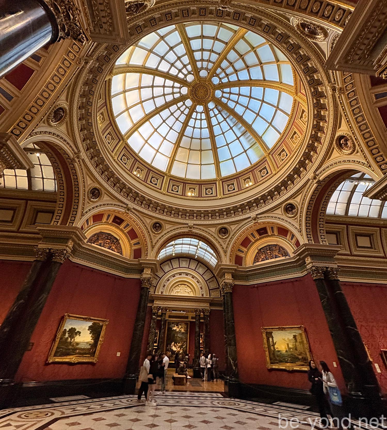 ナショナル・ギャラリーには複数の入口がありますが、トラファルガー広場側のメインエントランスから入ると、主要な展示室へ放射状に広がる中心空間「セントラル・ホール(Central Hall)」が迎えてくれます。見上げれば、重厚な大理石の柱とクラシカルな天井装飾、自然光を取り込むドーム型天窓が目を引きます。足元には精緻なモザイク模様が広がり、まだ入口に立ったばかりとは思えないほど、その壮麗さと格式の高さに圧倒されます。