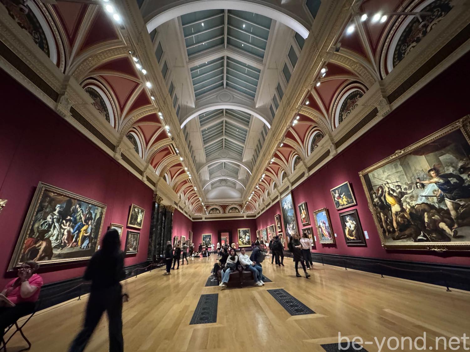 「Room 32」は、カラヴァッジョやグイド・レーニなど、大型で劇的なイタリア・バロック絵画の傑作が集まっている展示室。エンジ色の壁と幾何学的な天井のデザインが印象的です。