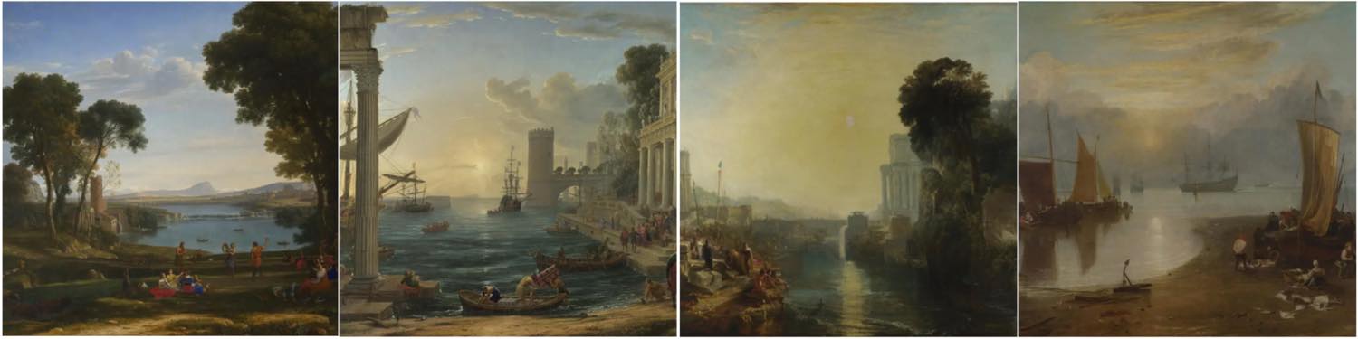 「Room 36」には、17世紀フランスの風景画家クロード・ロランの作品(写真左上の2点)と、19世紀イギリスの風景画家J.M.W.ターナーの作品(写真右上の2点)が並びます。この展示は、ターナーが1851年の死去に際し、自作をナショナル・ギャラリーへ遺贈する条件として「常にクロードの2作と並べて展示すること」を遺言に残したことに基づくものです。時代も画風も異なる2人の巨匠の作品を、直接比較しながら鑑賞できる貴重な空間です。