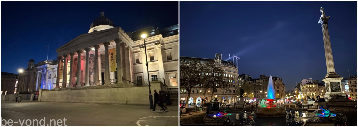 ギャラリーを出ると、外はすっかり夜の装い。トラファルガー広場一帯が美しいライトアップに包まれていました。