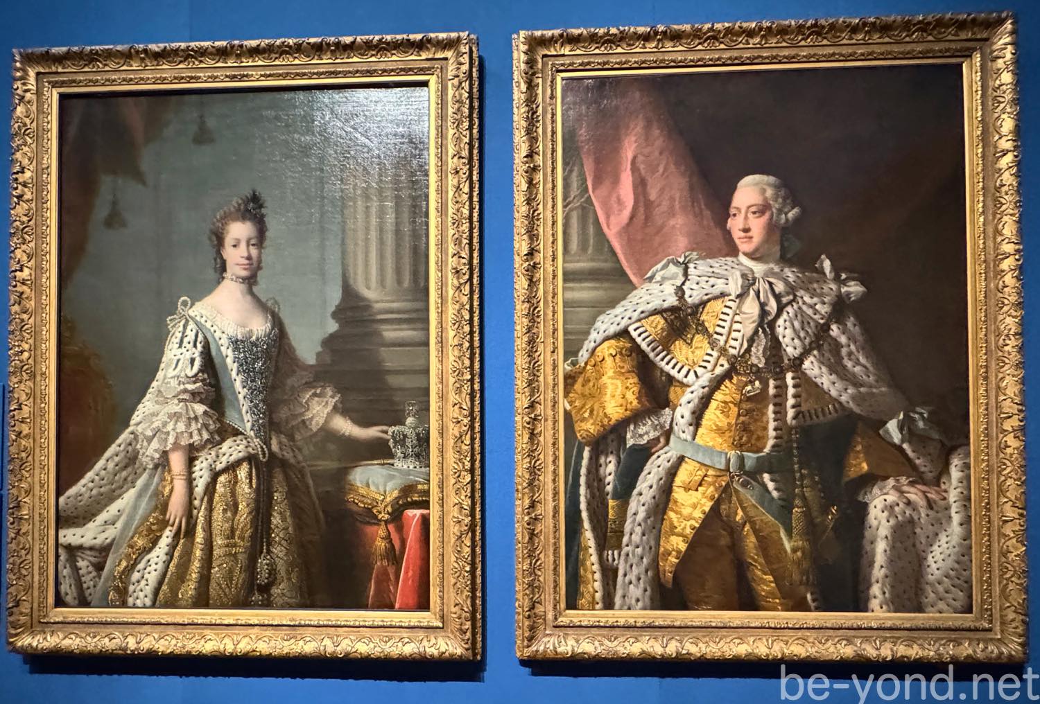 下写真は、18世紀イギリスの国王夫妻・ジョージ3世(在位1760〜1820)と王妃シャーロットを描いた肖像画。いずれも戴冠式の正装で描かれ、豪華な金糸の礼服と毛皮のマント、王冠や笏など王権の象徴が配されています。