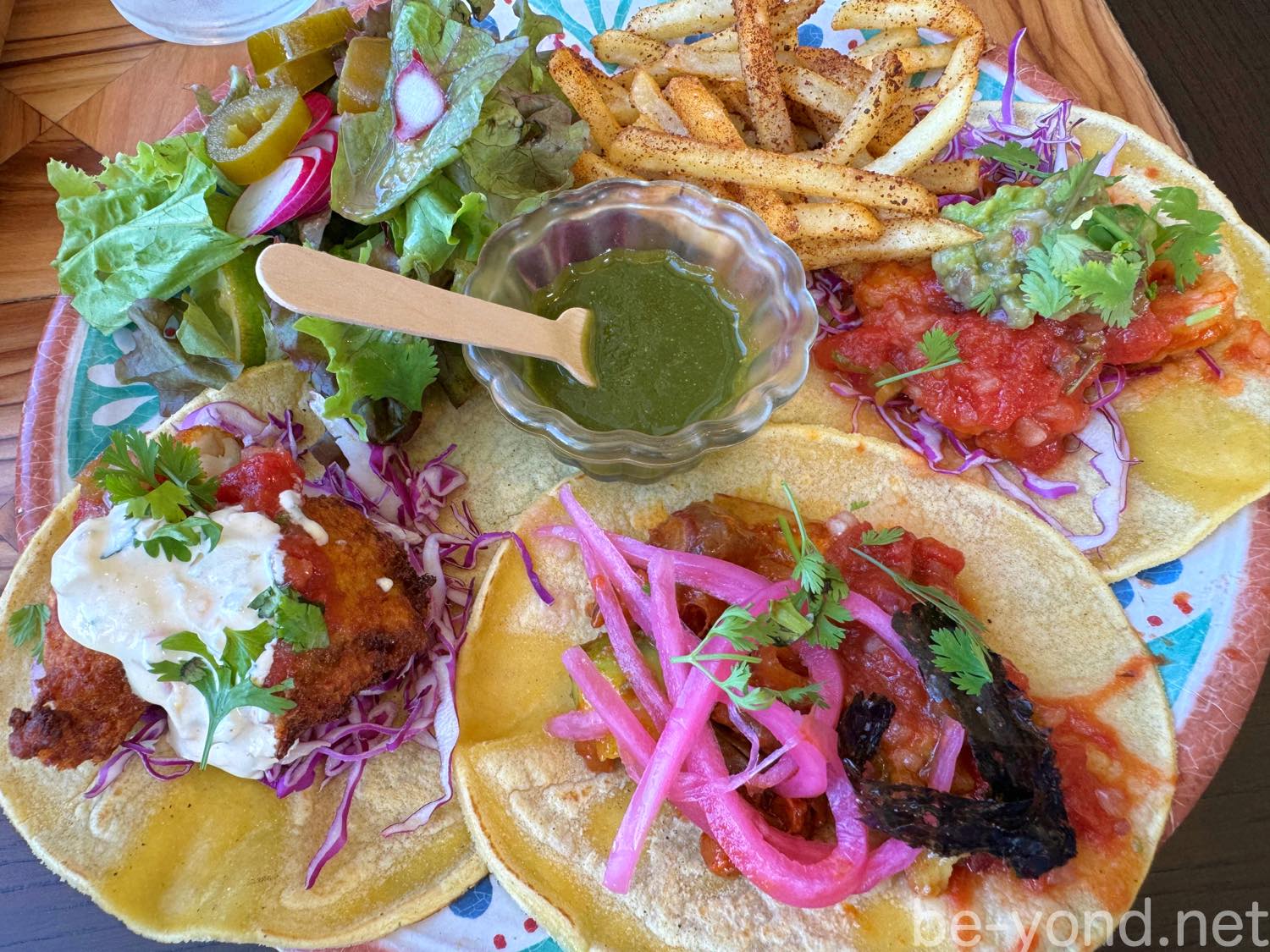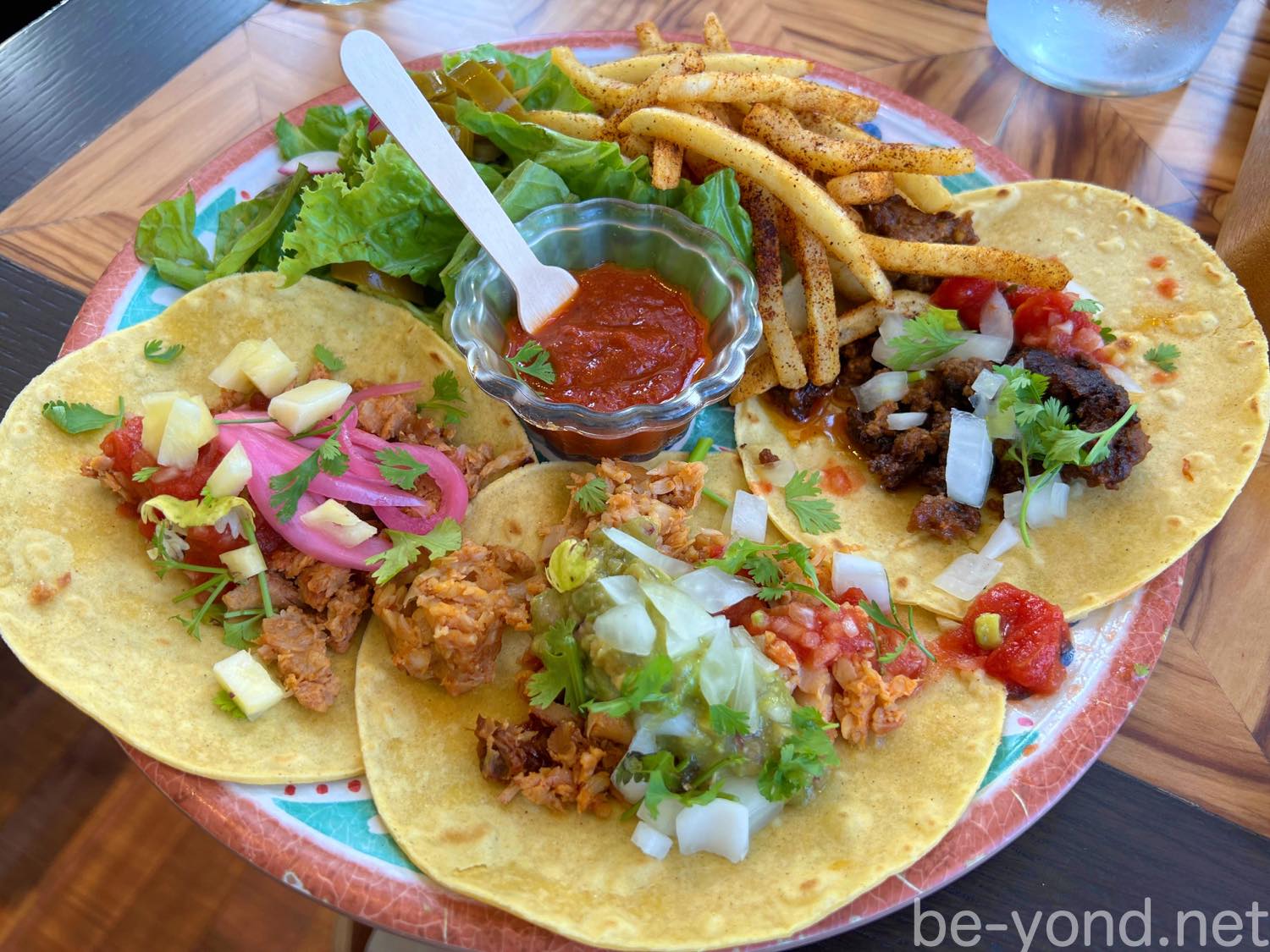 こちらはスパイシーチョリソー、スパイスマリネチキン、豚のスパイスマリネの「ザ・カルネタコスサンプラー」。タコスサンプラーは3種類のタコスが食べられるプレートで、サラダとフレンチフライ付きで満足感も高いです♪