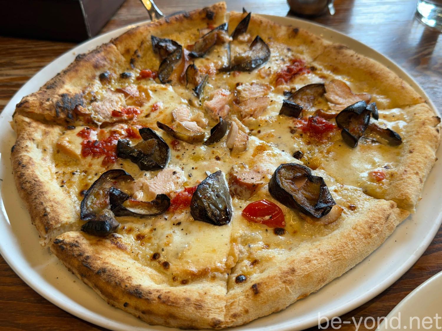チョイスしたピザはアンチョビクリーム、スモークドチキン、ナス、ドライトマト、スカモルツァチーズ、パルメザンチーズが入った「燻製チキンのフマーレ」。ピザは普通サイズでも十分なサイズ感。本格的なピザ窯焼きでモチモチです♪