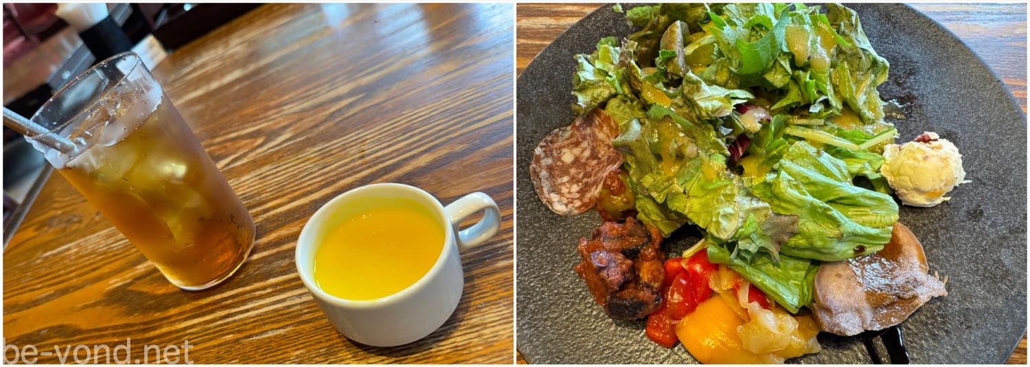 まず最初に供される本日のミニスープは冷製のコーンスープ。ドリンクは大きめのグラスで、飲むのに時間がかかるので先に持ってきてもらいました。
