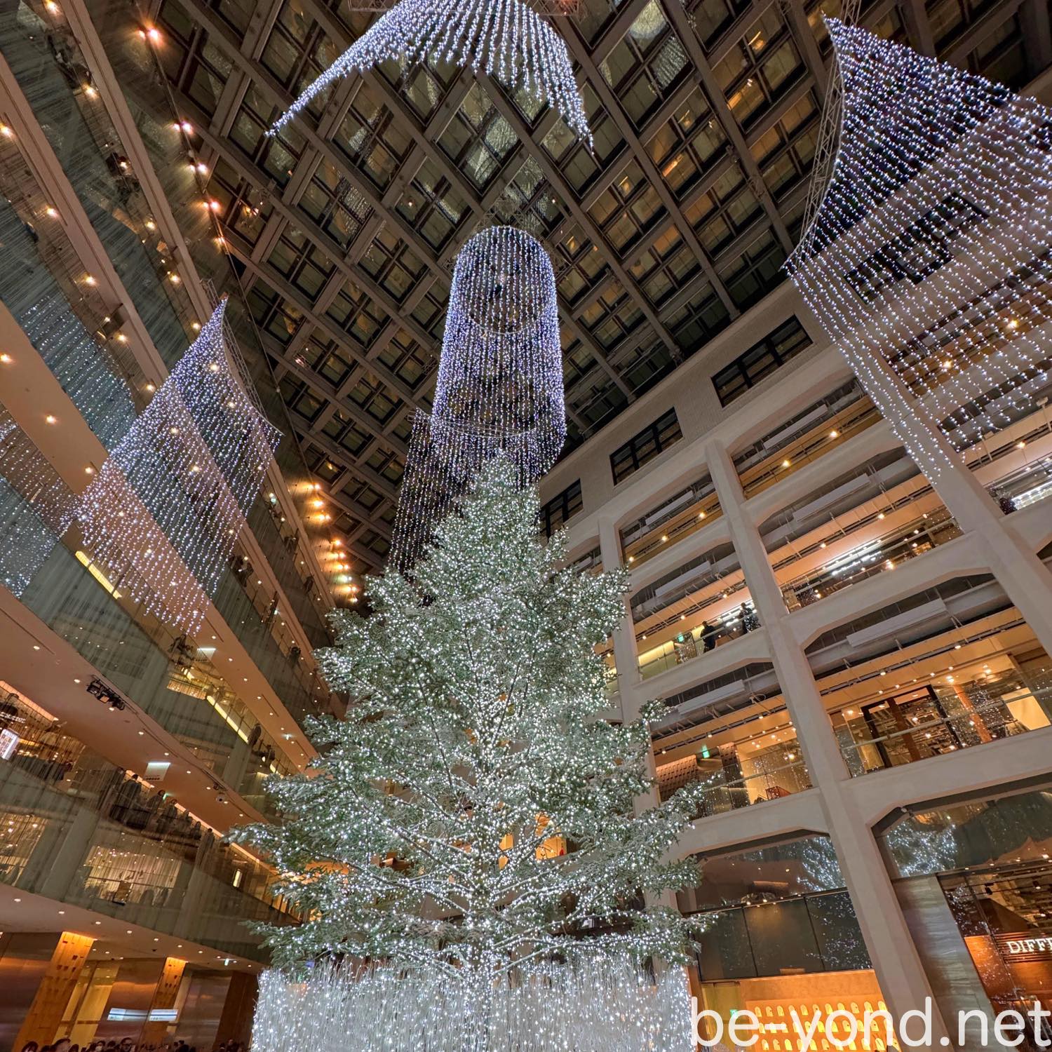 Marunouchi Street Parkを訪れたら見逃せないのが、「KITTE丸の内」の吹き抜けアトリウム。繊細な光で構成された大型オブジェやクリスマスツリーが迎えてくれます。透明感のあるホワイトやシルバーを基調に、氷や雪、光の粒を思わせる幻想的な白銀の世界が広がり、洗練された冬の世界観が印象的です。