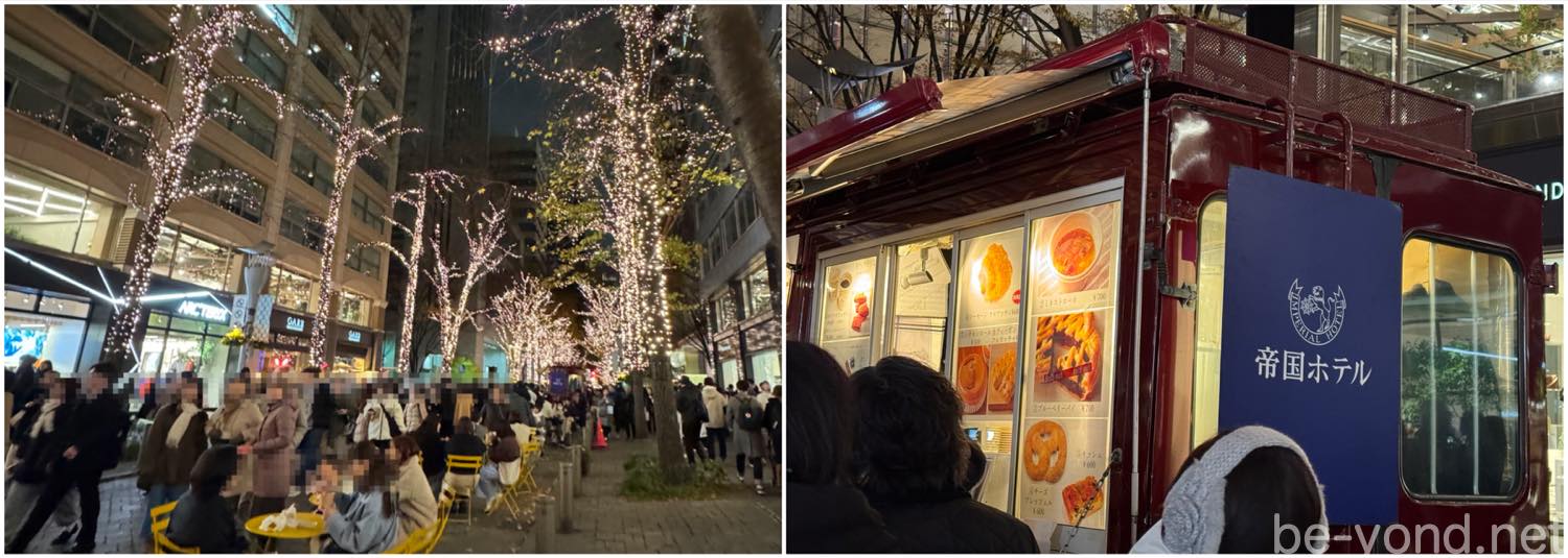 通り沿いに出店された帝国ホテルのキッチンカーでは、スープやキッシュ、パイなどが販売され、用意された屋外テーブルで温かなグルメを楽しむ人々の姿も見られます。