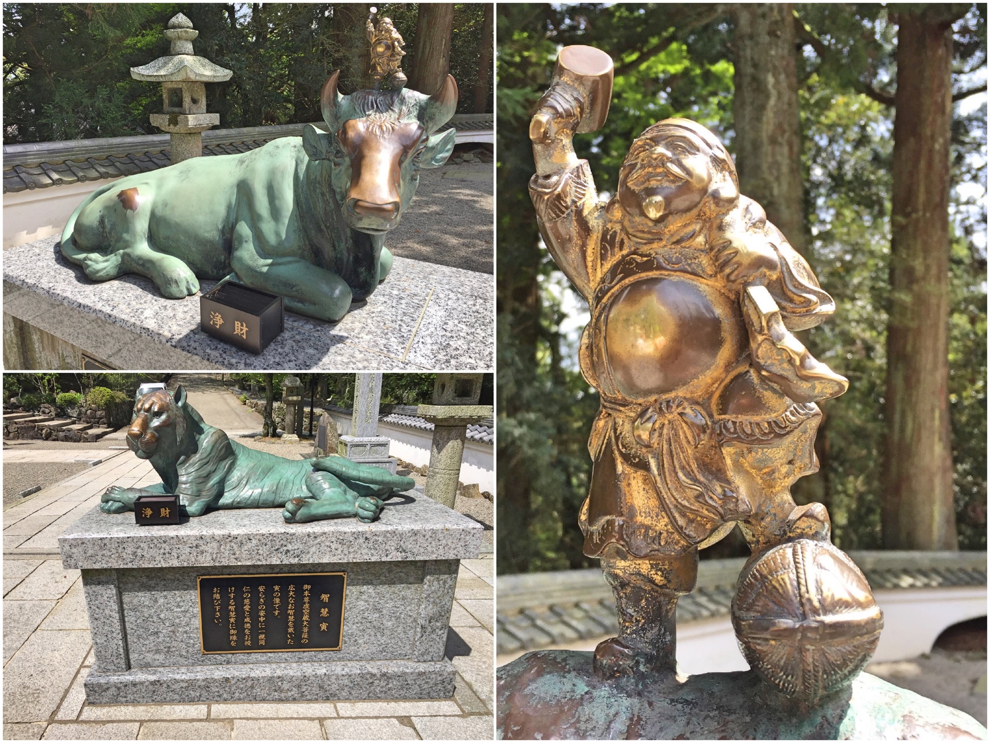 本堂の前には、福丑と智恵寅の像があり、丑の頭上には黄金色に輝く大黒様が打ち出の小槌を持って天を仰いでいます。