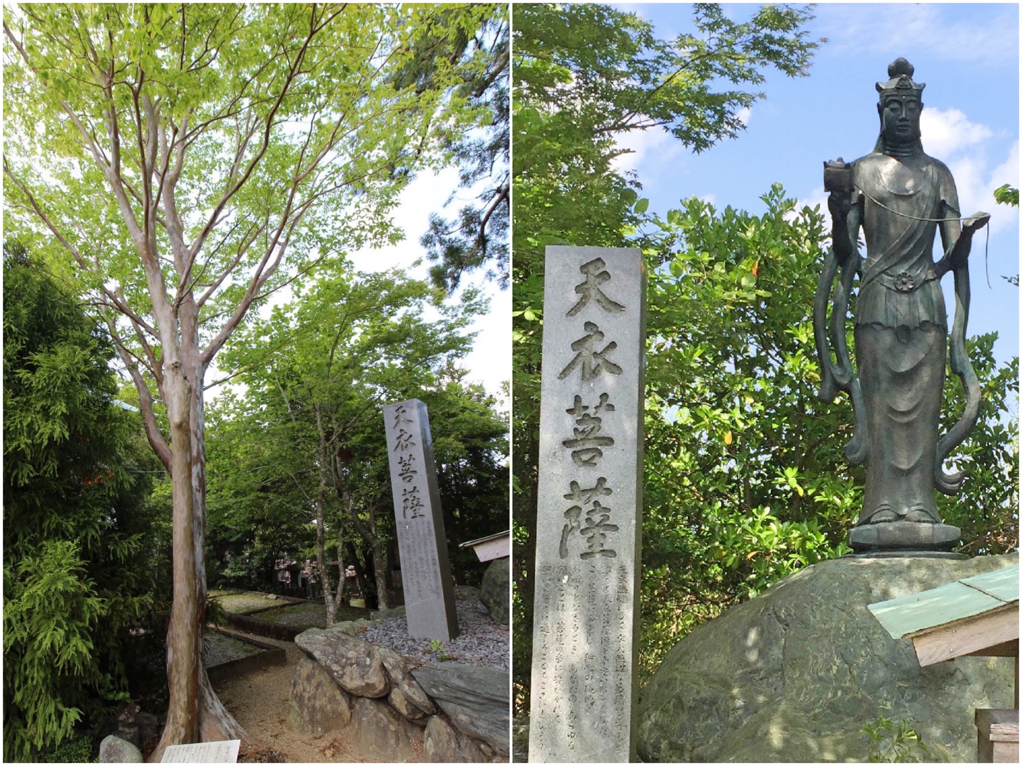 極楽門の横には初夏に白い花をつけるという沙羅の木と穏やかな表情の羽衣菩薩像が立っています。