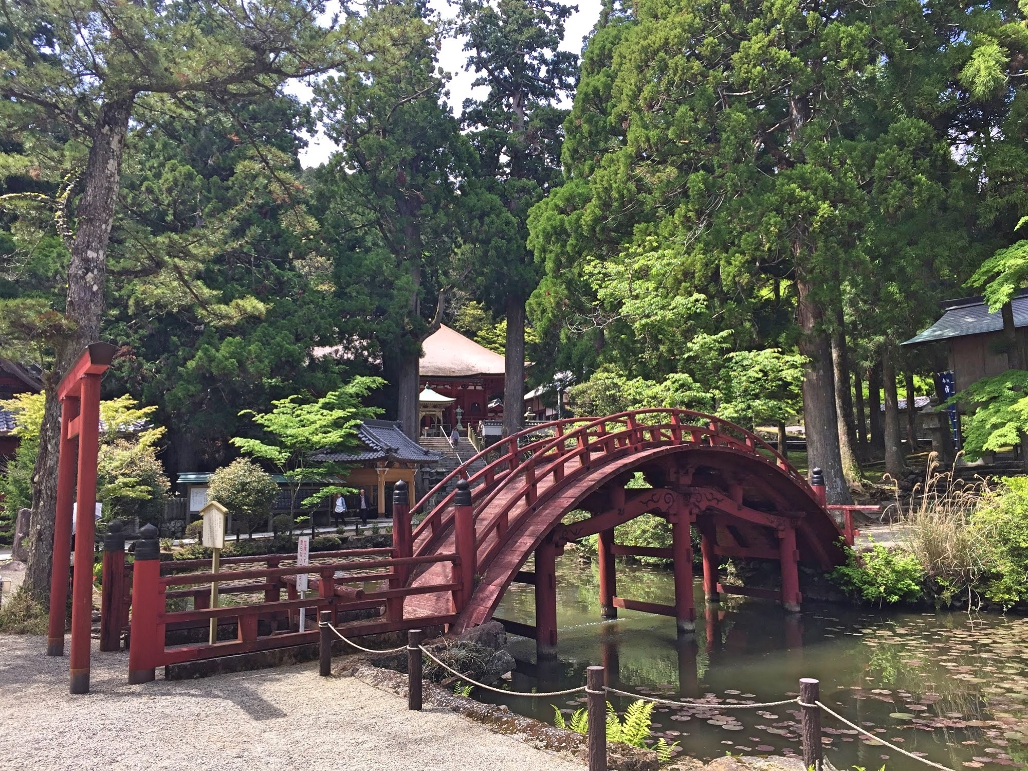 迷いの世界と悟りの世界、相対する心の境地を表現している連珠橋(現在立入禁止)を渡った先に「雨宝堂」があります。ちなみにこの太鼓橋の構造として、池底に橋脚が固定されていないのだそうです。