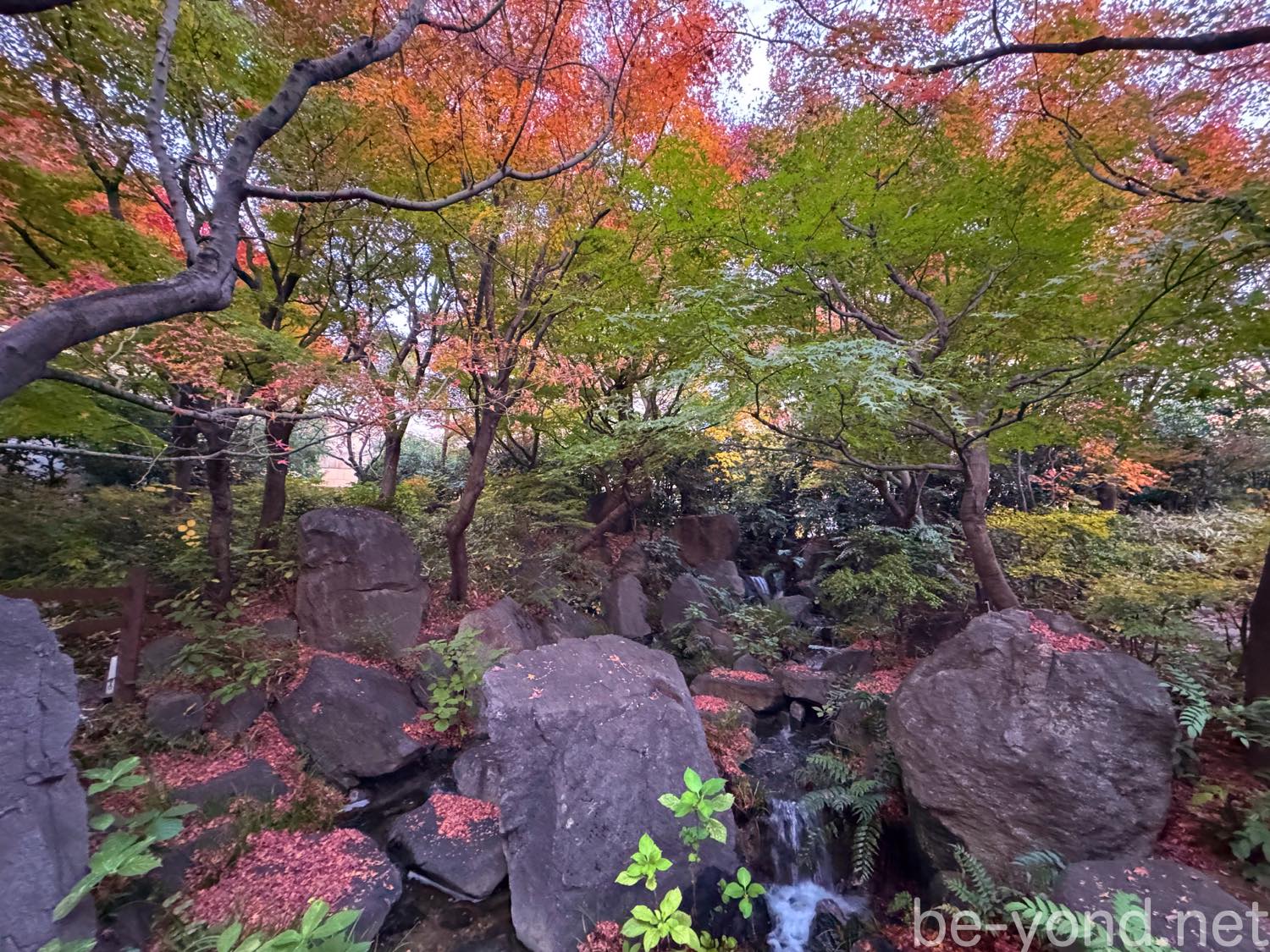 日が暮れる前に毛利庭園を訪れると、まだ美しい紅葉が彩りを残していました。