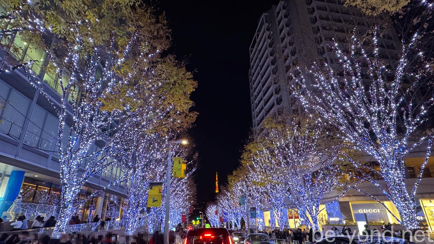 東京タワーが見えるベストスポットまではたどり着けず、人の波に遮られて思うように写真は撮れませんでしたが、けやき並木に一斉に明かりが灯り、通り全体が冬の輝きに包まれて歓声が上がる瞬間だけは、しっかりと動画に収めることができました。