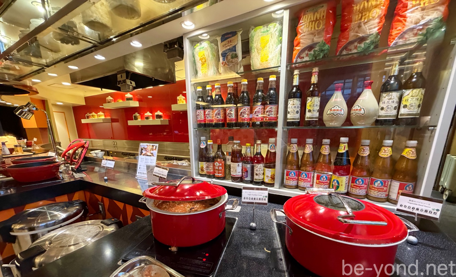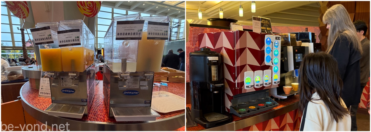 ドリンクは、ポップなキャンディのオブジェが飾られたスイーツコーナーに、オレンジ、リンゴ、グレープフルーツなどのフルーツジュースとココナッツウォーターが並び、入口付近のカウンターには、ソフトドリンクをはじめ、珈琲などの専用マシンが設置されています。こちらは朝の一杯を求める宿泊客が列を作っていました。