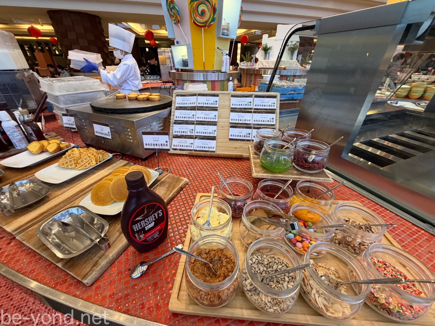 温かいパンケーキやワッフルが並ぶ後ろの鉄板には、こんがりと美味しそうに焼き上げられたフレンチトーストが。カスタマイズが楽しくなるようなトッピングも豊富に用意されています。この他にもシェラトンのマークが入った季節感のある桜あんぱんや、数種類揃ったヨーグルト、さらにはアイスクリームまで用意されていました。朝からデザート類も充実のラインナップです。