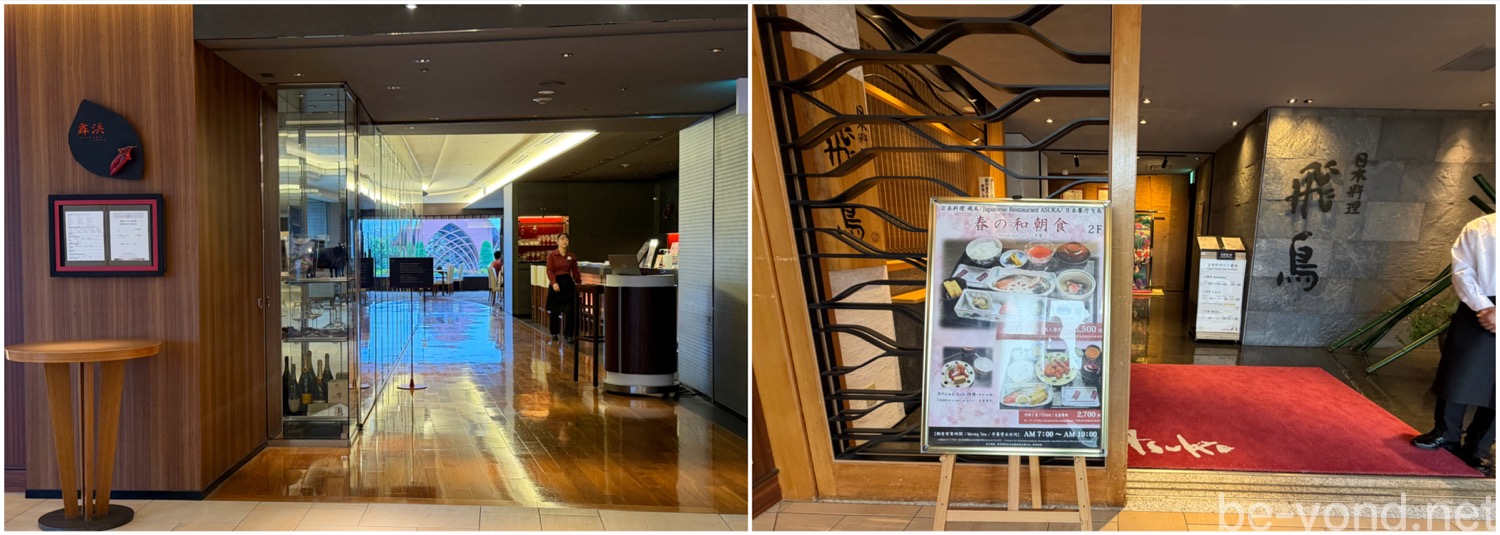 2階のステーキハウス「舞浜Teppanyaki+」(7:00〜10:00)のビュッフェは、品数は少し劣るとしても和食は充実しているようで、ガーデンが眺められる落ち着いた雰囲気の会場とのこと。2階の日本料理「飛鳥」では、焼き魚や卵焼きに小鉢が並ぶ和定食を提供しています。朝はやっぱり和食がいいという方にぴったりです。
