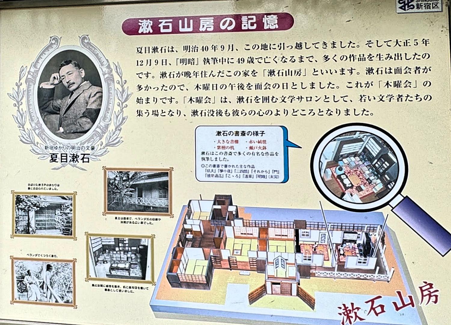 夏目漱石は、明治40年9月、この地に引っ越してきました。そして大正5年12月9日、「明暗」執筆中に49際で亡くなるまで、多くの作品を生み出したのです。漱石が晩年住んだこの家を「漱石山房」といいます。漱石は面会者が多かったので、木曜日の午後を面会の日としました。これが「木曜会」の始まりです。(漱石公園内の案内板より引用)