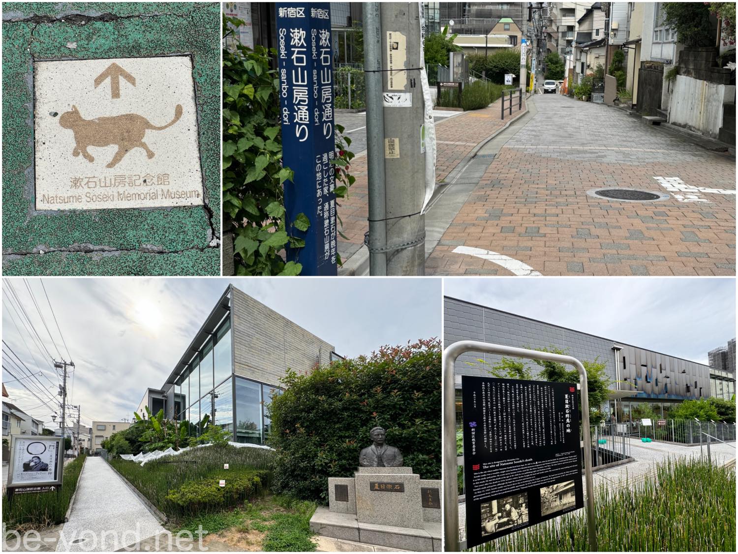 漱石山房記念館のすぐ隣(敷地の一部)が新宿区指定史跡「新宿区立漱石公園」になっていて、園内には漱石の胸像のほか、漱石や漱石山房に関する資料を展示している情報発信施設「道草庵」や、漱石の没後に遺族が家で飼っていたという小鳥や犬、猫の供養のための「猫塚」などがありました。また、公園の500mほど西の夏目坂下には漱石生誕の地碑が建てられています。