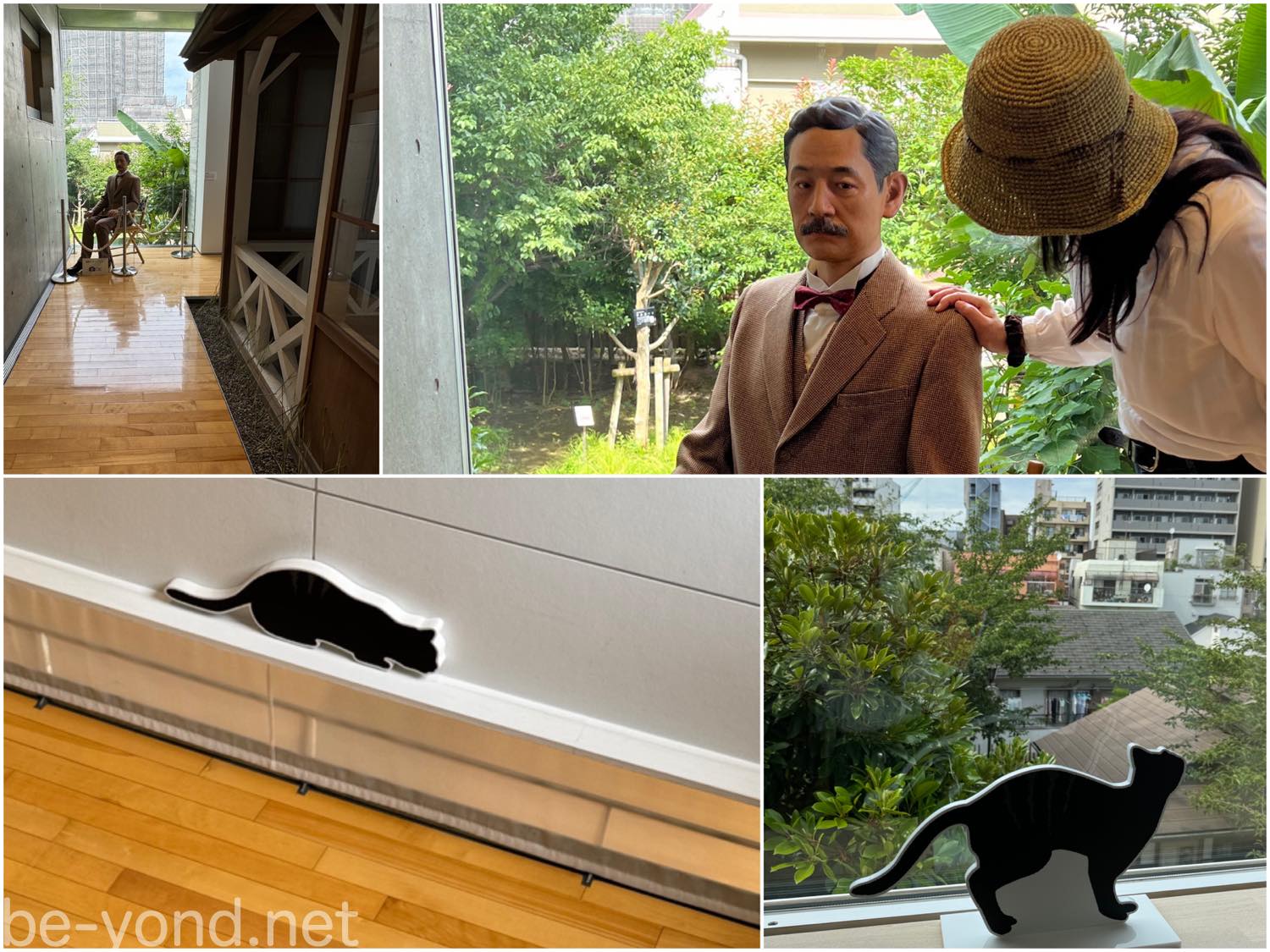夏目漱石が暮らした家は和洋折衷の平屋建て。その中で特徴的だったのがこのベランダ式回廊だったそうで、漱石山房書籍の展示を出てぐるりとベランダ回廊をまわったところに等身大の夏目漱石人形が座っていました。こんなふうに一息つくこともあったのかもしれませんね。コチラは撮影スポットになっているので一緒にパシャリ。ベランダ回廊や階段など館内各所に猫も登場します。