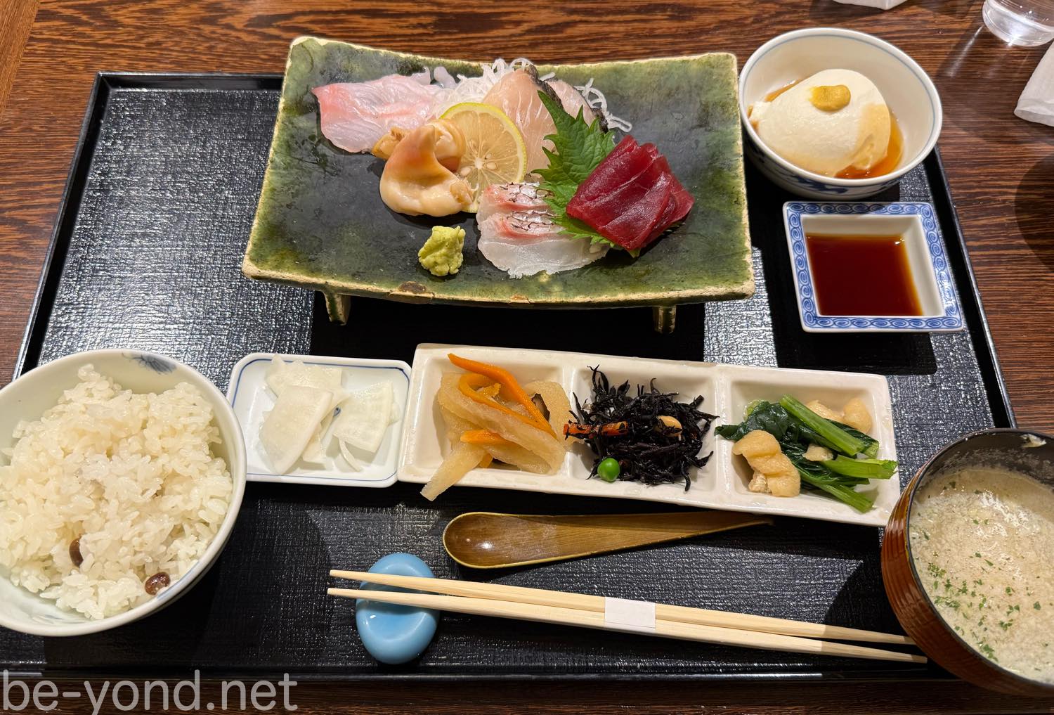 「お刺身定食」は、マグロ、つぶ貝、鯛に加え、旬のカンパチやサワラなど5種類の新鮮なお造りと、ひじきや煮物などの小鉢3種、さらに寄せ豆腐が添えられた、見た目も味わいも満足できる定食です。