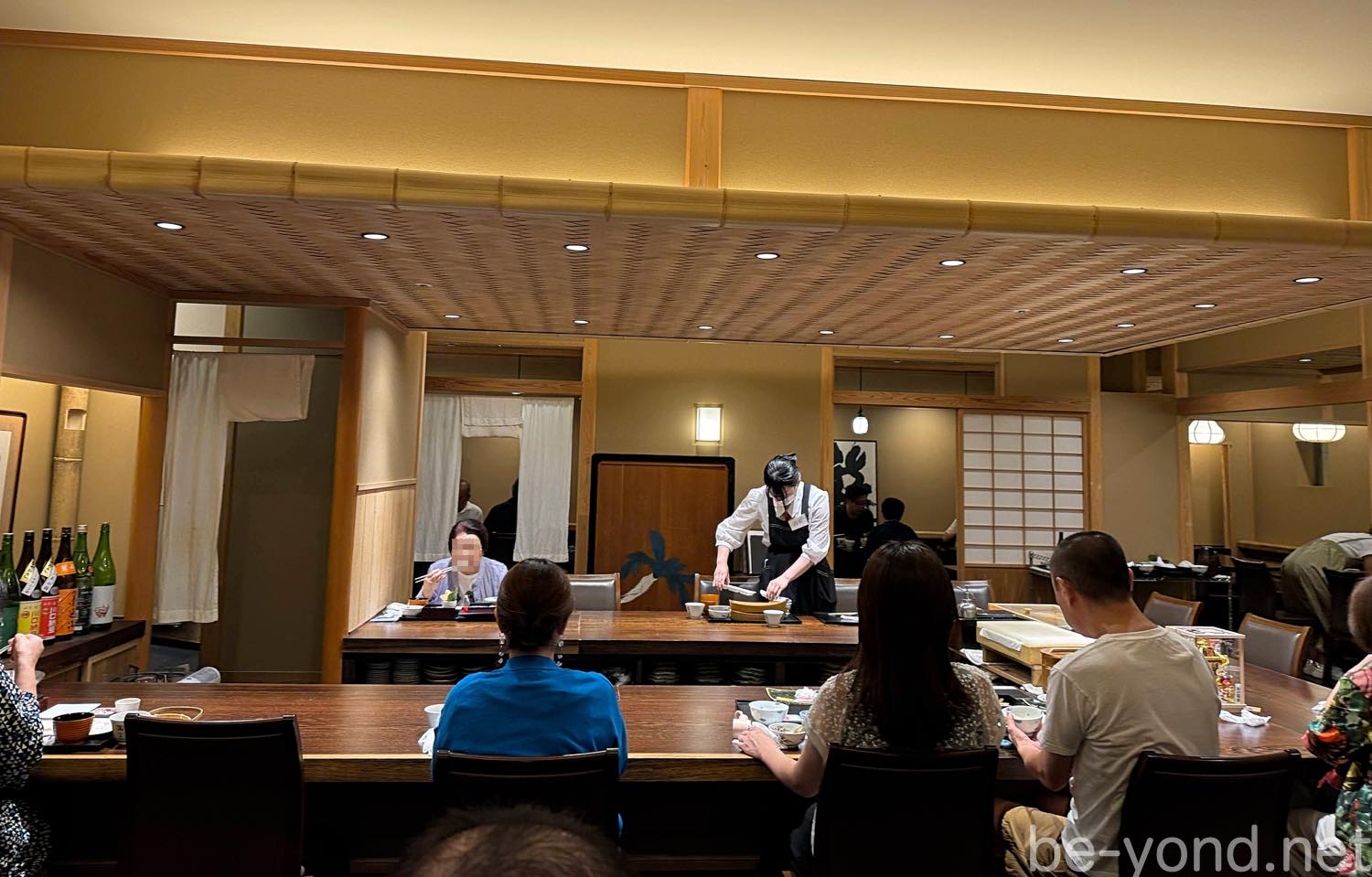 賑やかな丸井のレストラン街から一歩店内に入ると、外の喧騒がすっと遠のき、落ち着いた和の空気がふんわりと広がります。カウンター席やテーブル席、個室を備えた全席イス席の空間は、ゆっくりと食事を楽しめるつくりとなっています。客層は中年層以上が中心、夫婦連れやお一人でふらりと立ち寄る方の姿も見られます。