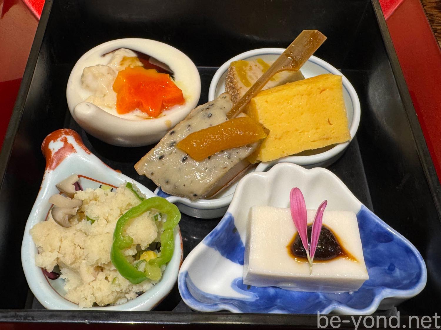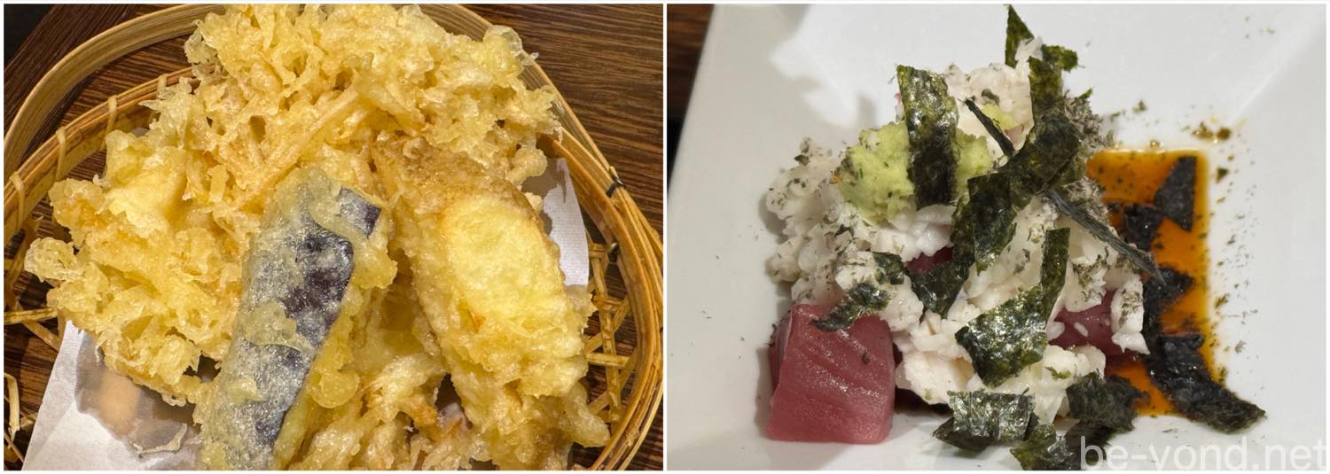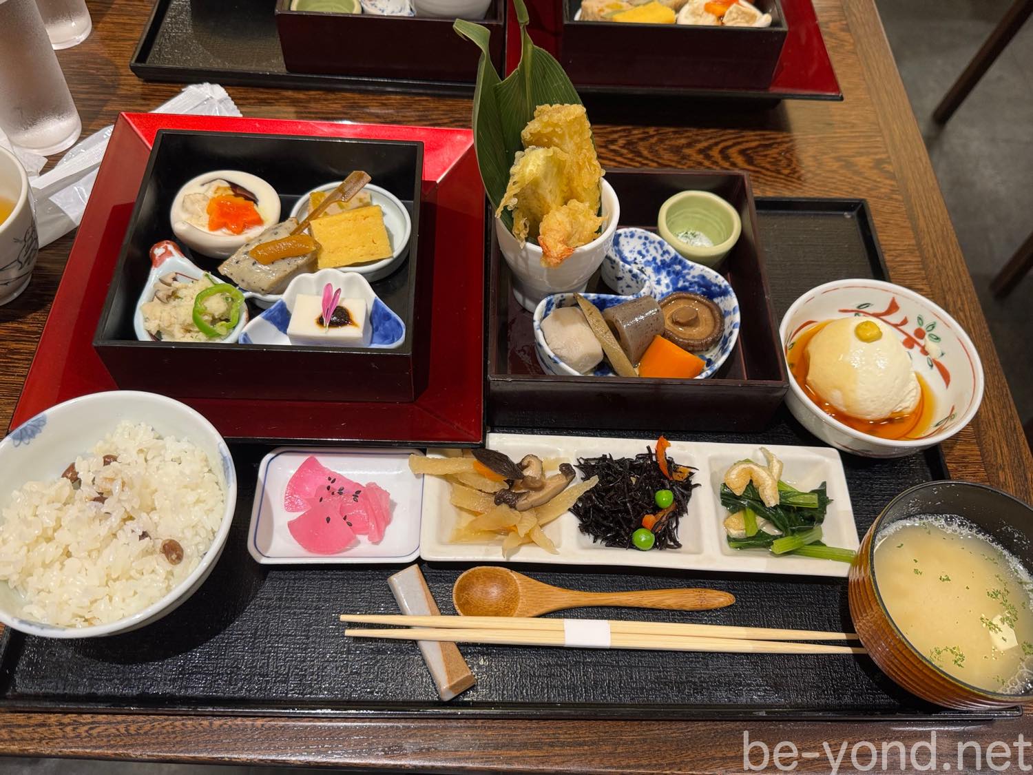 天ぷらは、灯火点心の内容とは少し異なり、かき揚げ、じゃがいも、なすなどの野菜天に加えて、胡麻豆腐や湯葉の天ぷらも楽しめます。鬼おろしにした山芋で和えたマグロの山かけは、心地よい食感が加わり、とても美味しくいただきました。