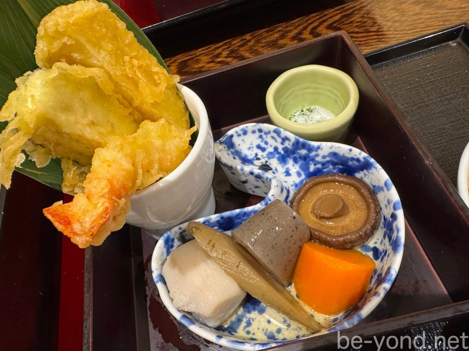 立てて盛り付けられた天ぷらは、エビ、ナス、サツマイモの3種類。カラッと揚がった熱々の天ぷらは、お塩でいただくタイプ。個人的にはおつゆ派ですが、たまに塩で味わうとさっぱりとしてまた違った美味しさがあります。煮物も、味がしっかり染み込んでいます。