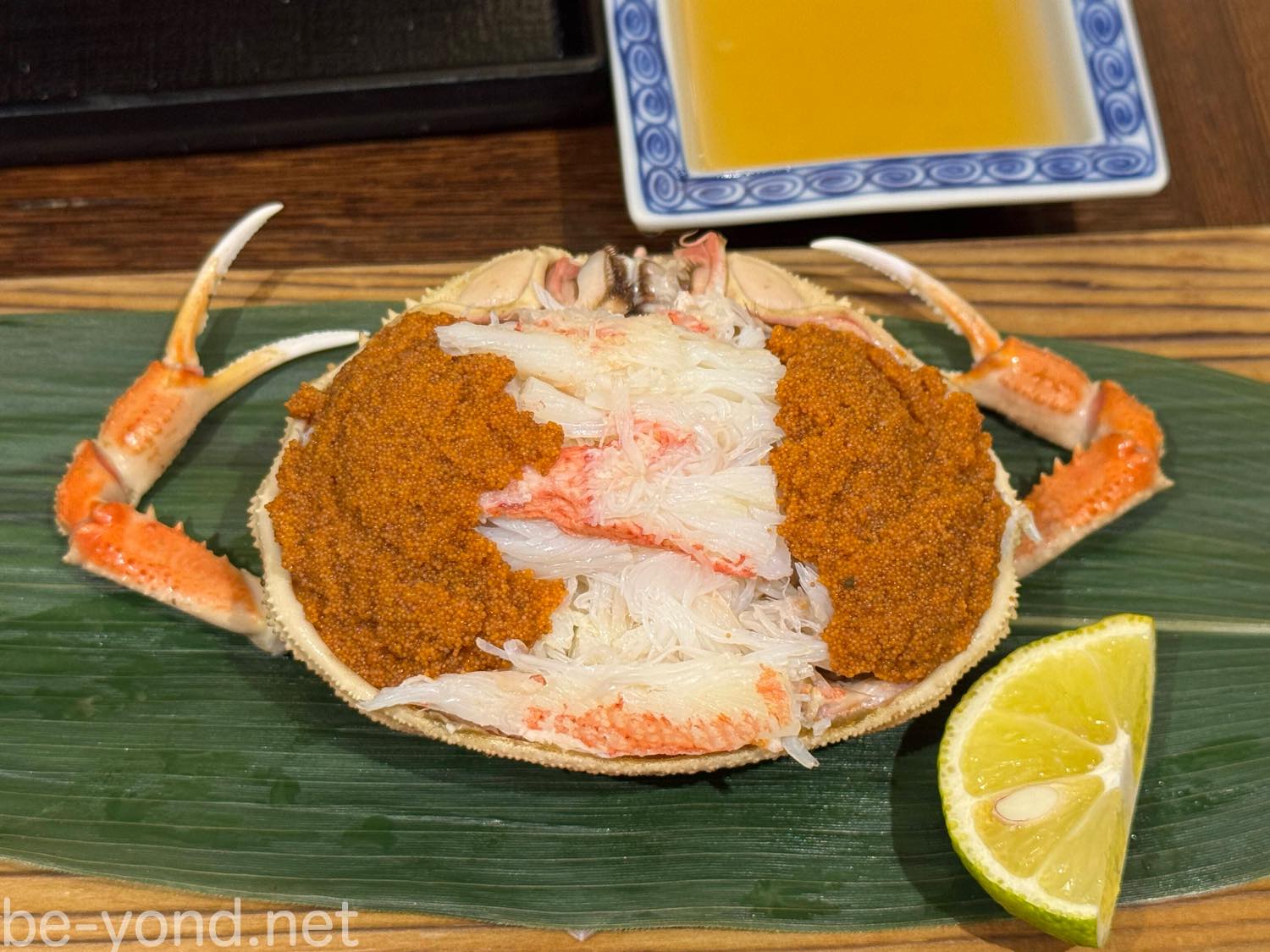 雄のズワイガニに比べてサイズは小さいものの、濃厚なコクと甘み、旨みがぎゅっと凝縮されており、他のカニでは味わえない美味しさがあります。蟹酢を添えていますが、そのままでも十分美味しく、殻がないため手を汚さずに、一口ずつゆったりと味わえます。