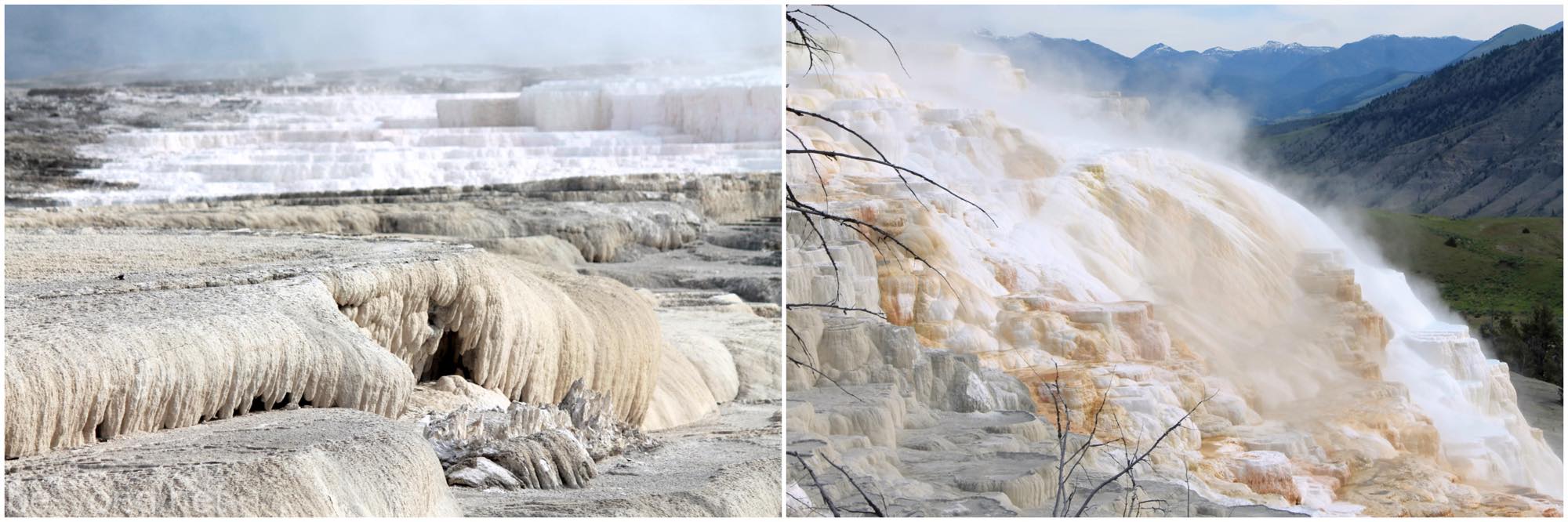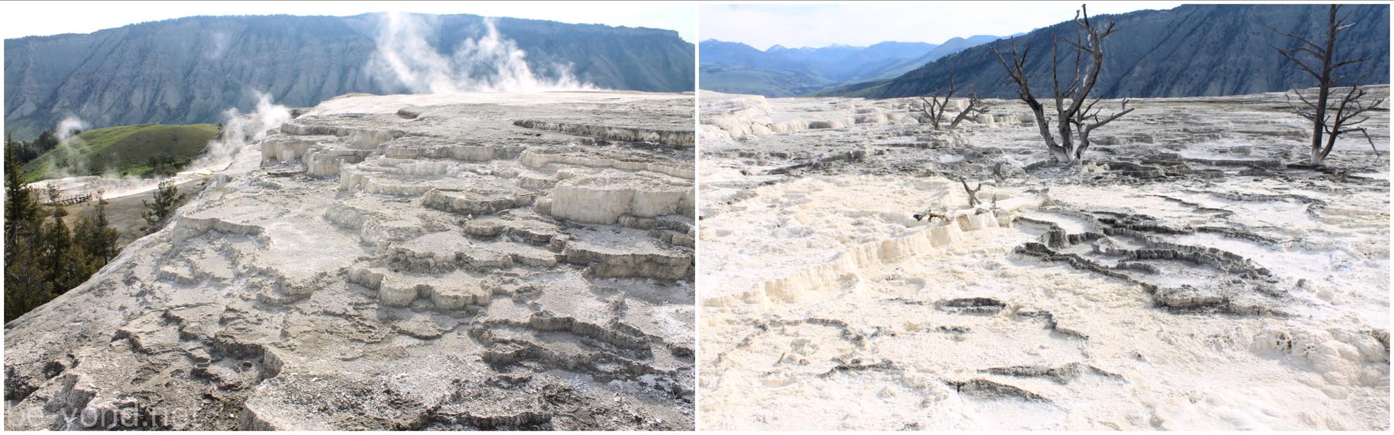 石灰華段丘と言えば真白な棚田とブルーの温泉が美しいトルコのパムッカレが有名ですが、ミネルバテラスも以前は豊富な温泉が湧き出る美しい棚田でした。現在はほとんどの温泉が枯れてしまい、酸化した石灰が黒ずんでいる部分が多く見受けられます。とはいえ、マンモスホットスプリングスは常に変化し続けている温泉地帯!またいつの日か突然ミネルバテラスに豊富な温泉が湧き出てくることがあるかもしれません。