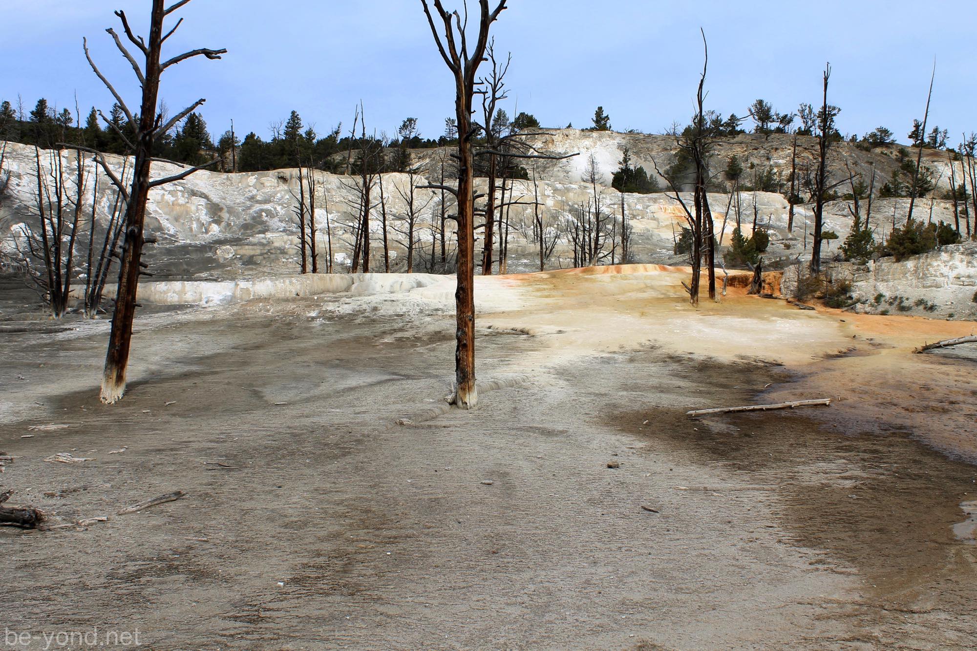 荒涼とした風景が広がる「ニュー ブルー スプリング(New Blue Spring)」。白い石灰棚と立ち枯れた木々の対比が印象的です。美しいブループールが見当たりません…。複雑に流れる地下水路は変わりやすく、突然水路が閉ざされたり、新たな水路ができたりすることで、常に流れが変化するため、表層のフォーメーションは刻々と変化しているようです。