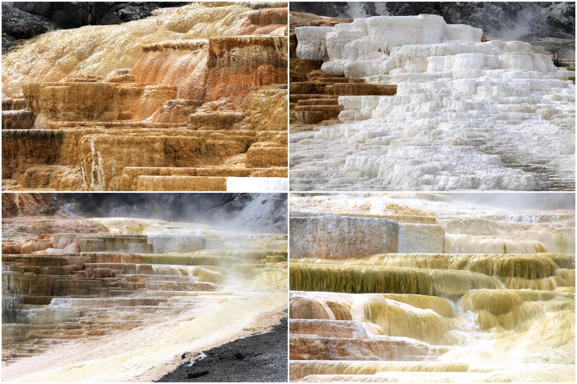まず最初に現れるのはオレンジ色の岩肌を持つ「オレンジ スプリング マウンド(Orange Spring Mound)」 。案内板によると、火山によって熱くなった地下水が、下からの強烈な圧力によって石灰層に浸透しながら炭酸カルシウムを溶解し石灰成分を含んだ熱水がいくつもの穴から噴出、オレンジスプリングマウンド上を流れることで少しづつ石灰華していくのだとか。岩肌は熱水に生息するバクテリアや藻類によって生き生きとした色合いのタペストリーが織りなされていきます。