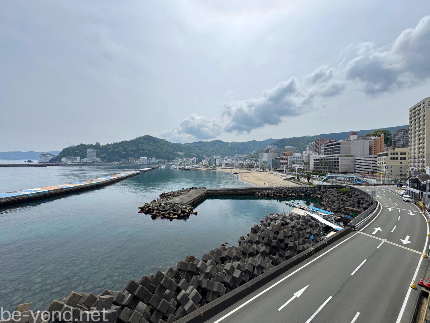 穏やかな海と砂浜、緑の山々を背景に、新しい高層ホテルやヤシの木が並ぶ風景は、まさにリゾートそのもの。一方で街には昔ながらの温泉街の雰囲気も残り、懐かしい昭和の面影も感じられます。リゾートの華やかさと郷愁が共存する独特で心地よい雰囲気が、熱海の魅力だと、改めて思わせてくれる風景です。
