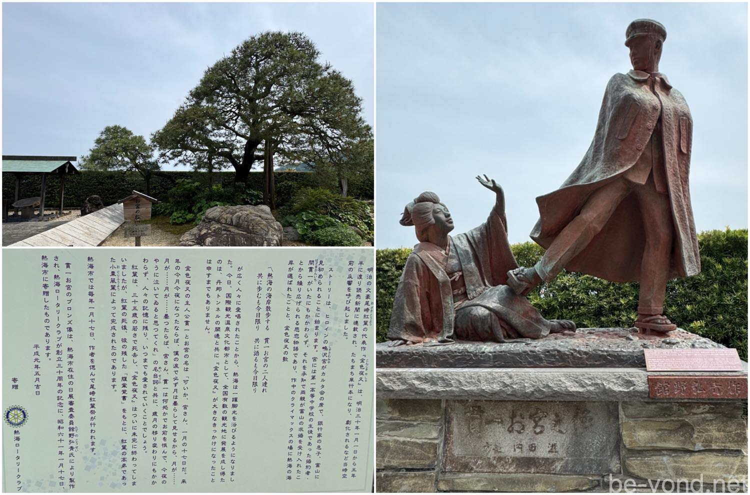 熱海海岸は、尾崎紅葉の小説「金色夜叉」の舞台となった場所。許嫁のお宮が富豪の息子に乗り換えてしまったことに激怒した貫一が、お宮を蹴り飛ばし、復讐を誓う場面を再現した「貫一・お宮の像」が、緑地のなかほどに設置されています。