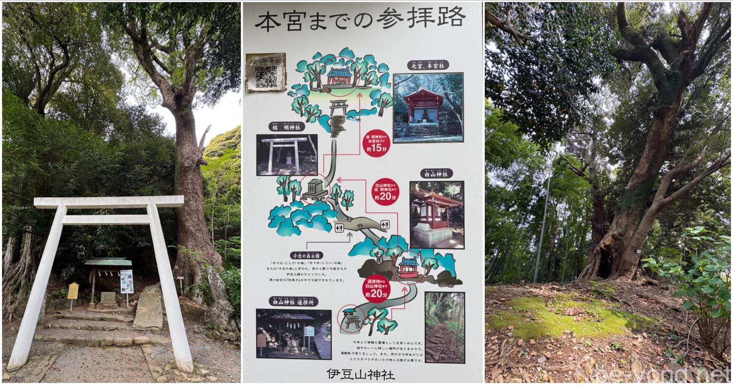 伊豆山神社には本宮へと続く参拝路があり、途中には白山神社遥拝所や光宮・本宮社などが点在しています。本宮まで登ったことはないのですが、案内板によると白山神社遥拝所から先、本宮までは約55分(遥拝所→白山神社約20分、白山神社→結 明神社約20分、結 明神社→本宮約15分)かかるため、往復すると2時間ほどの行程になるようです。