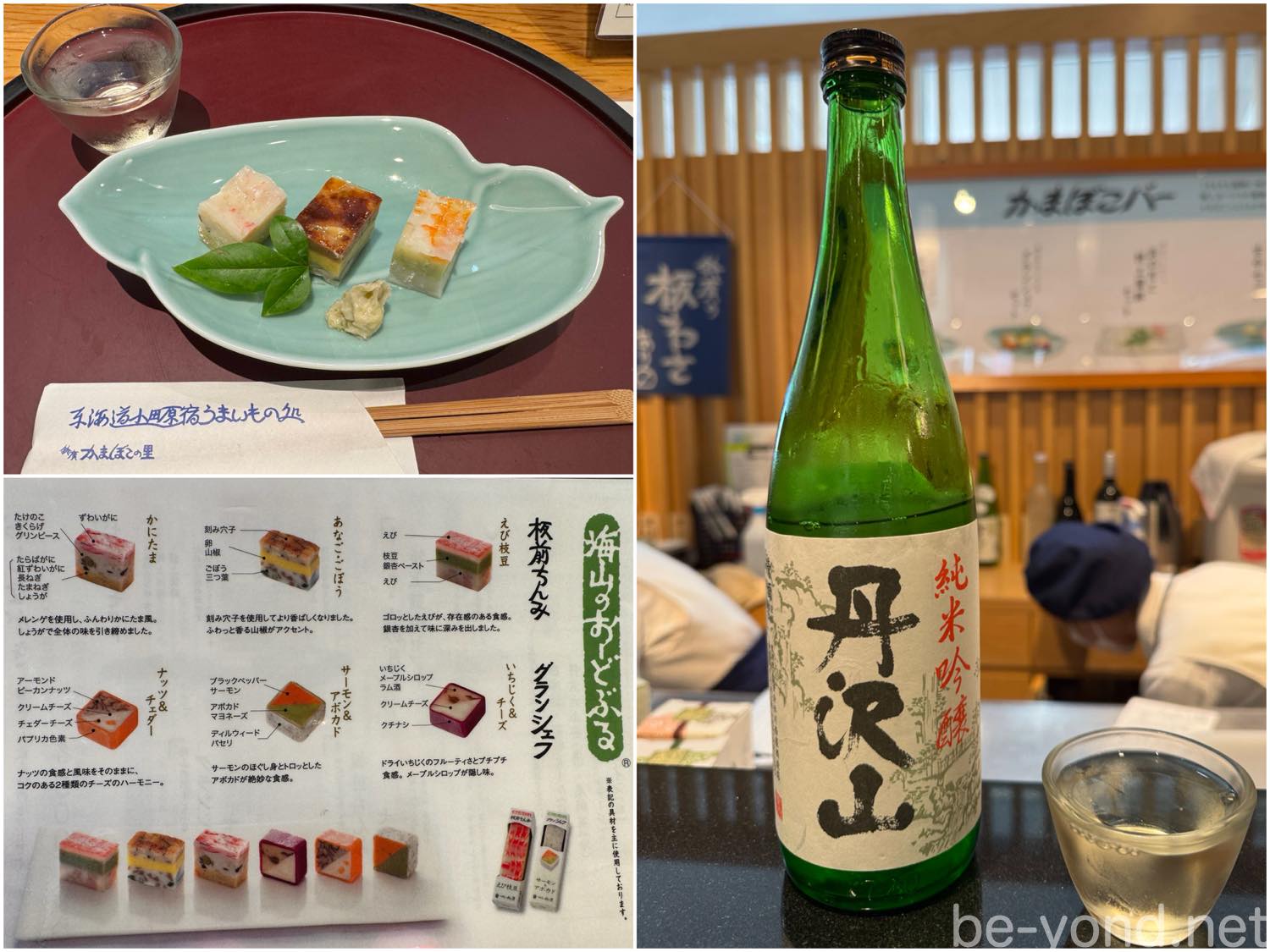 館内にある「かまぼこバー」では、5種類のかまぼこセットが用意されており、それぞれの味の違いをじっくりとテイスティングできます。「海山のおーどぶる」と呼ばれるセットもあり、海や山の素材を使った彩り豊かな一品を、日本酒や地ビールと一緒に気軽に楽しめるのも魅力です。今回はお試しセットと板前ちんみを注文しました。