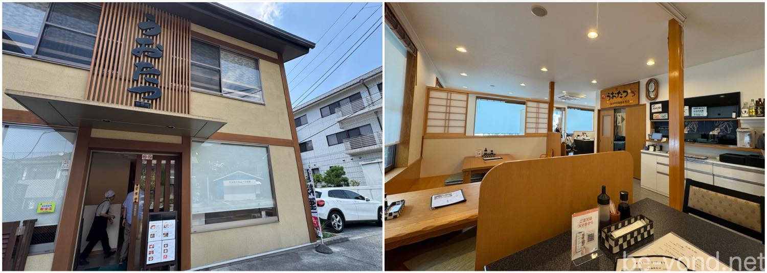 湯河原周辺には数多くの和食屋さんがありますが、今回選んだのは駐車スペースが10台と比較的多い日本料理店「うおたつ」です。湯河原駅から車で数分、県道75号線沿いにあります。ランチタイム真っ只中で店内は満席、駐車場も満車でしたが、運良く駐車スペースが空き、入店することができました。(写真は別日の営業開始直後に撮影したもの)